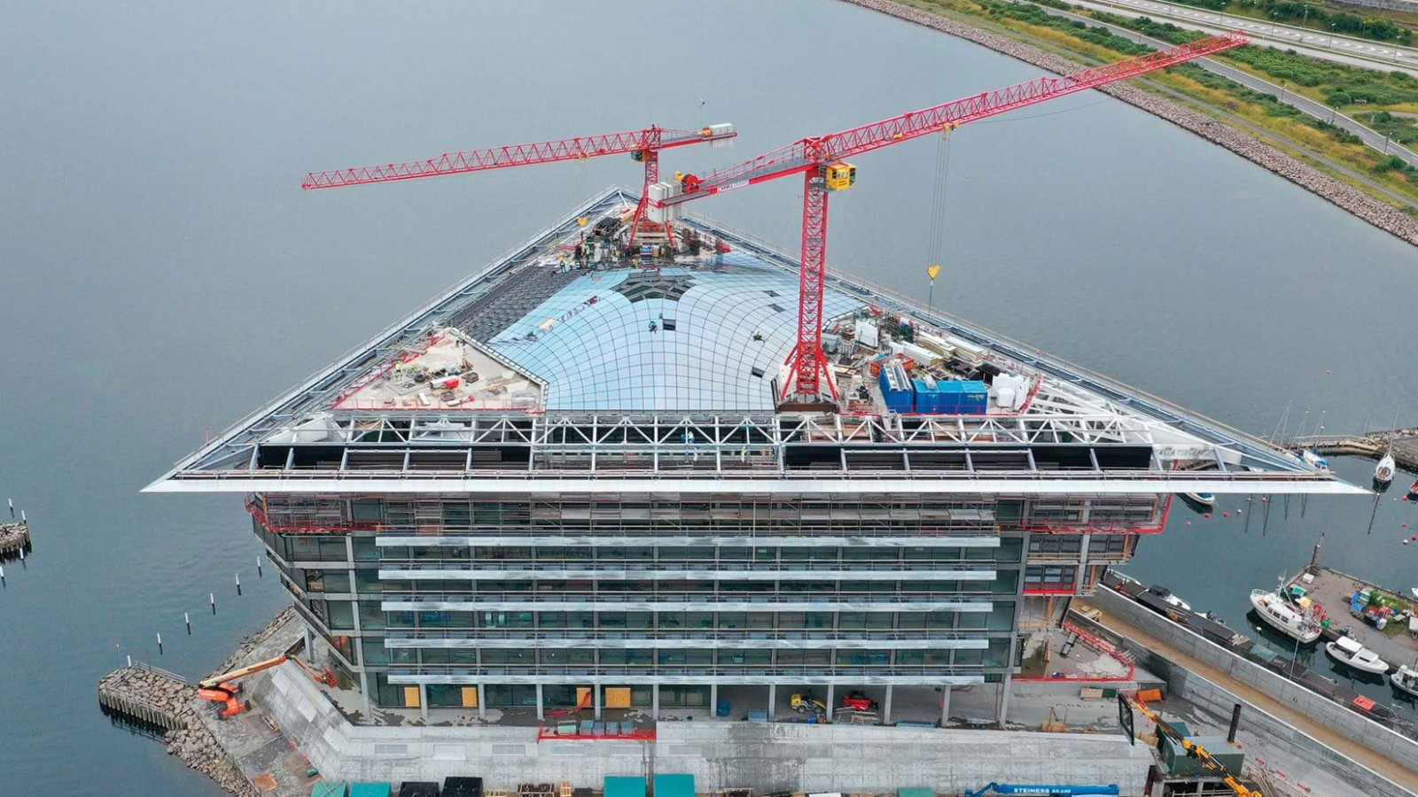 L’effetto è possibile grazie all’imponente vetrata che si sviluppa sull’intero perimetro dell’edificio. Dall’interno, una vista mozzafiato sullo stretto di Öresund, tra Copenhagen in Danimarca e Malmö in Svezia. Dall’esterno, entrano i raggi del sole a inondare di luce naturale gli uffici, l’ingresso, la caffetteria, le sale conferenza.