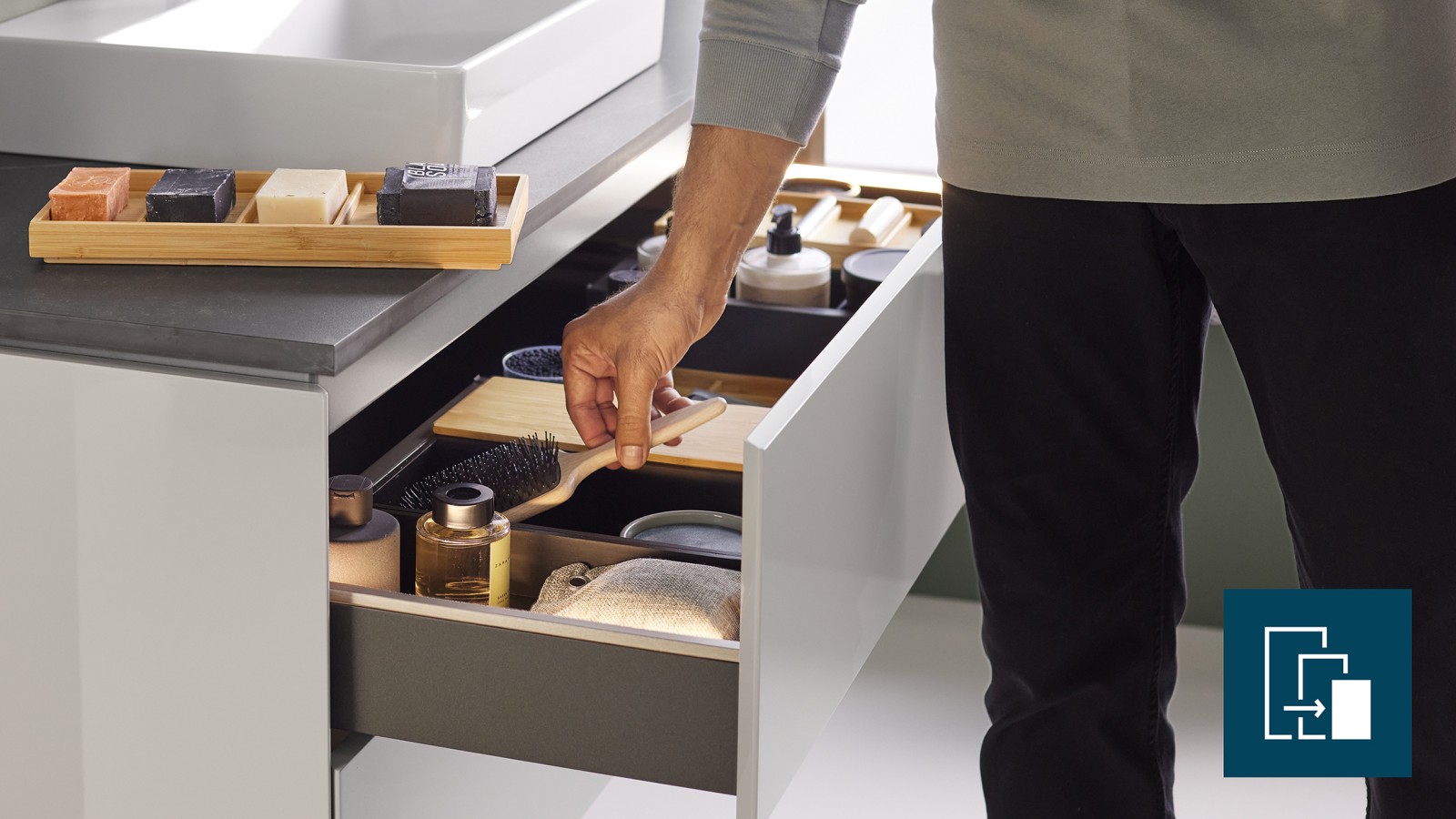 Nel bagno, lavabo e mobile formano un insieme armonioso e funzionale. Anche l’interno del mobile riveste un ruolo importante: i designer Geberit hanno sviluppato eleganti elementi in legno pensati per organizzare al meglio lo spazio nei cassetti.
